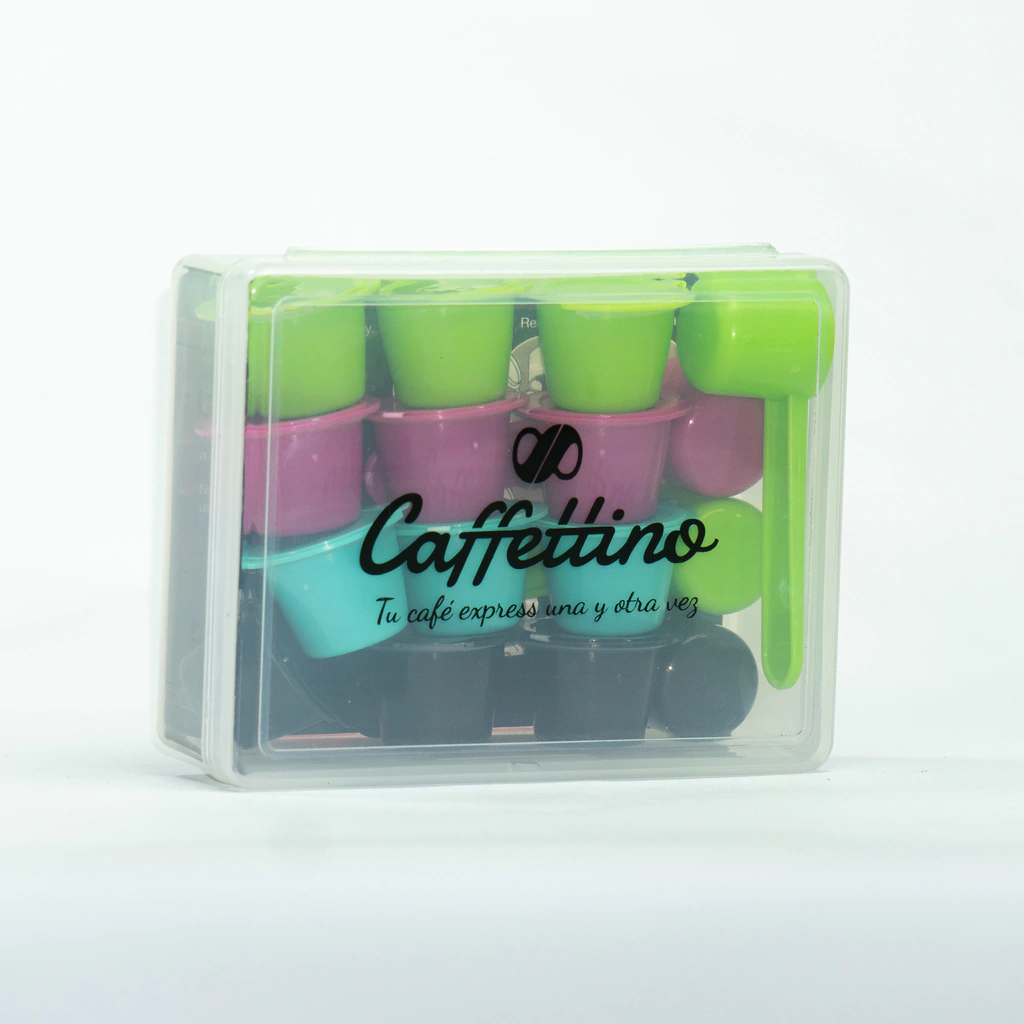 Cápsulas reutilizables compatibles con sistema Nespresso para ser utilizadas con café tostado molido, soluble, té o yerba mate. Vienen en un práctico y elegante estuche para guardar las cápsulas luego de su uso sobre la mesada o en la alacena. Contine 12 cápsulas en vívidos colores para personalizar las cápsulas a gusto y 4 cucharas con la medida justa para cargar adecuadamente la cápsula. Cada cápsula se puede reutilizar un mínimo de 100 veces. Con cada cápsula podés realizar un pocillo express (30ml). Para un largo o "lungo"(110ml) utiliza dos cápsulas. COMPATIBLES CON TODAS LAS MAQUINAS DE LA MARCA NESPRESSO.